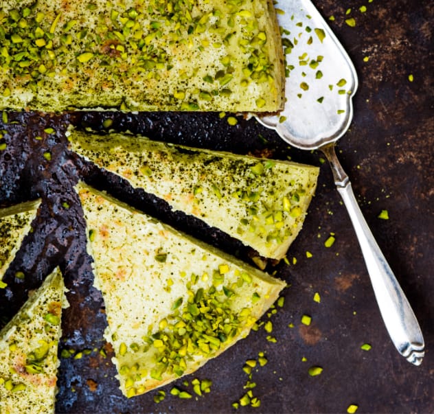 Anschließend die Masse in die Springform füllen und den Kuchen für 45 Minuten backen. In der Mitte darf er noch etwas weicher sein. Danach den Kuchen auskühlen lassen und 1 Stunde im Kühlschrank fest werden lassen. Vor dem Servieren mit den gehackten Pistazien garnieren. |